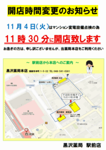 駅前店 11月4日(火)開店時間変更のお知らせ