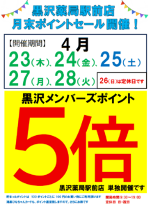 黒沢薬局 駅前店 限定、月末ポイントセール開催